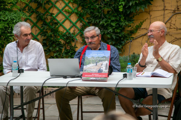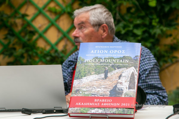 Στον αύλειο χώρο της Αγιορείτικης Εστίας πραγματοποιήθηκε σήμερα το απόγευμα, Πέμπτη 2 Ιουνίου, η παρουσίαση του τόμου του κ. Φραγκίσκου Μαρτίνου με τίτλο: «Άγιον Όρος – Πέτρινα Τοξωτά Γεφύρια και Υδραγωγεία».
