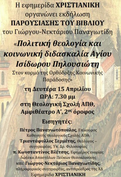 Η Εφημερίδα ΧΡΙΣΤΙΑΝΙΚΗ οργανώνει εκδήλωση παρουσίασης του βιβλίου του Γιώργου-Νεκτάριου Παναγιωτίδη με τίτλο: “Πολιτική θεολογία και κοινωνική διδασκαλία Αγίου Ισιδωρου Πηλουσιώτη στον κορμό της Ορθόδοξης Κοινωνικής Παράδοσης”.