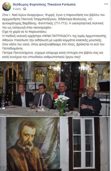 Στον Ι. Ναό Αγίων Αναργύρων, Ψυρρή, έγινε η παρουσίαση του βιβλίου του αρχιμανδρίτη Παντελεήμονος Τσορμπατζόγλου, διδάκτορα θεολογίας, «Ο αυτοκράτορας Βαρδάνης- Φιλιππικός (711-713). Η εκκλησιαστική πολιτική του ως εισαγωγή στην εικονομαχία».