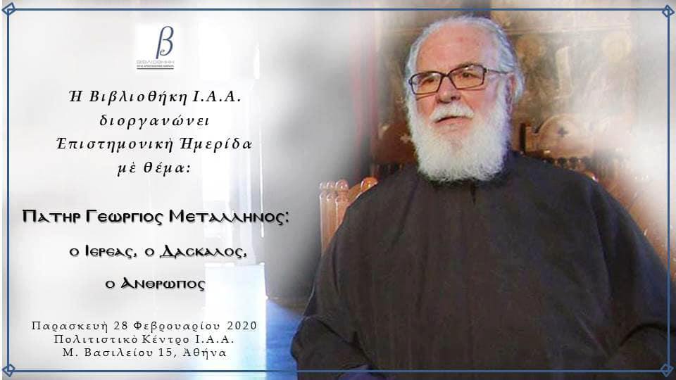 Η Βιβλιοθήκη της Ιεράς Αρχιεπισκοπής Αθηνών διοργανώνει Επιστημονική Ημερίδα με θέμα: “ΠΑΤΗΡ ΓΕΩΡΓΙΟΣ ΜΕΤΑΛΛΗΝΟΣ, Ο ΙΕΡΕΑΣ, Ο ΔΑΣΚΑΛΟΣ, Ο ΑΝΘΡΩΠΟΣ”, κατά την Παρασκευή 28 Φεβρουαρίου 2020, στο Πολιτιστικό Κέντρο της Ι.Α.Α., Μ. Βασιλείου 15, Αθήνα.