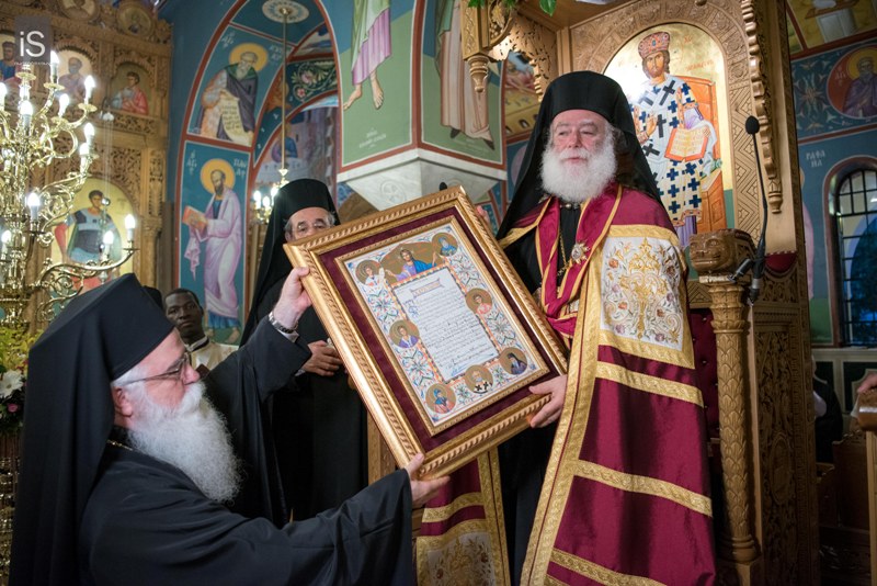 Ακολούθως, ο Σεβασμιώτατος απένειμε στον Μακαριώτατο κ. Θεόδωρο την ανώτατη τιμητική διάκριση της Ιεράς Μητροπόλεως Δημητριάδος, ήτοι τον χρυσούν της σταυρόν μετά Διπλώματος και Αστέρος, ως ελάχιστη αναγνώριση των μεγάλων υπηρεσιών που προσφέρει σε σύνολη την Ορθόδοξη Εκκλησία, ως μικρή αντίδοση της μεγάλης ευλογίας της επισκέψεώς Του και, τέλος, ως τεκμήριο της ταπεινής συνδρομής της τοπικής μας Εκκλησίας στο τιτάνιο αποστολικό έργο που επιτελεί στην Αφρικανική ήπειρο.