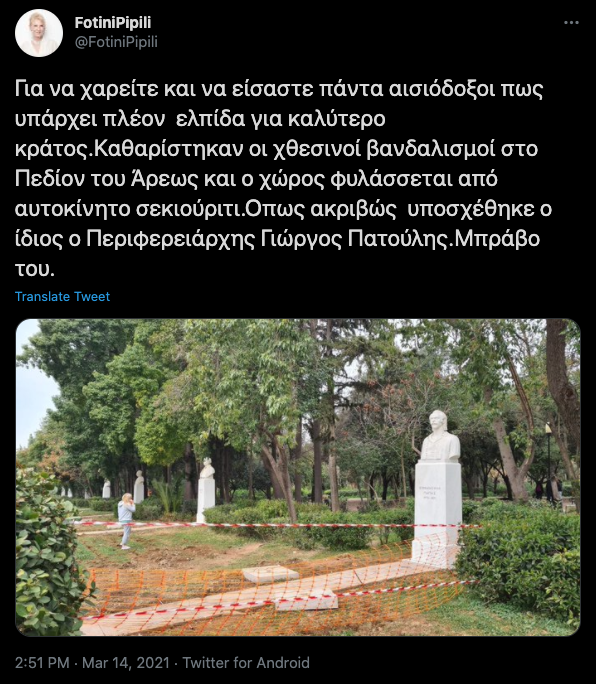 Από την πλευρά της, η βουλευτής της Νέας Δημοκρατίας Φωτεινή Πιπιλή, η οποία είχε καταγγείλει τα πρόσφατα περιστατικά βανδαλισμών στο Πεδίον του Άρεως, εκφράζει την ικανοποίηση της για την άμεση επέμβαση του Περιφερειάρχη Αττικής.
