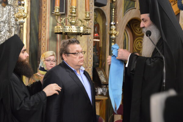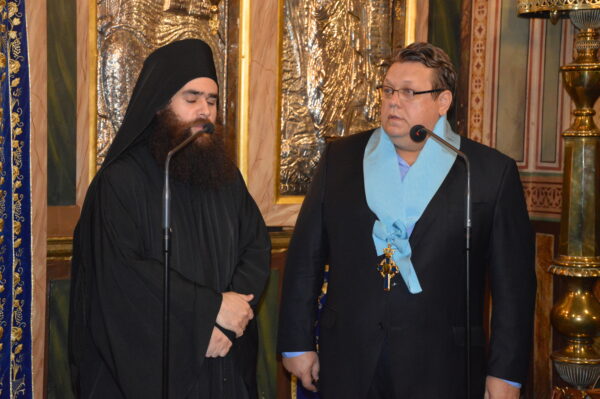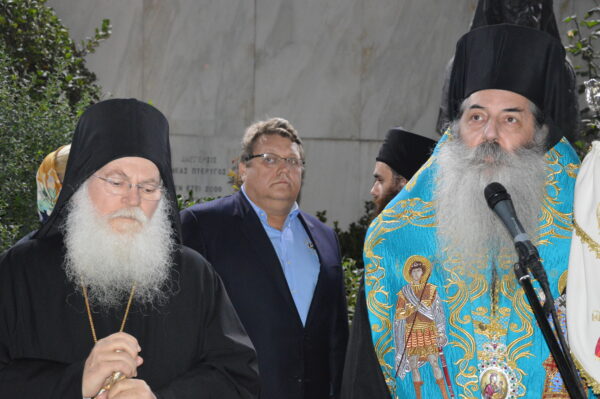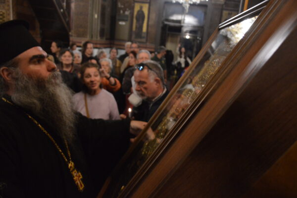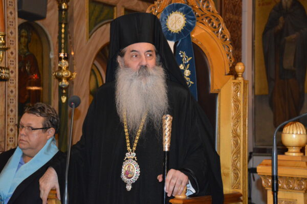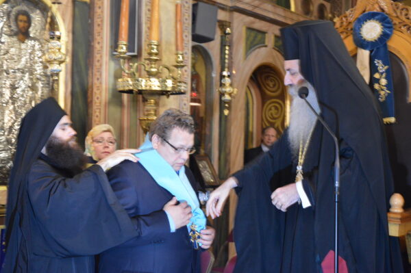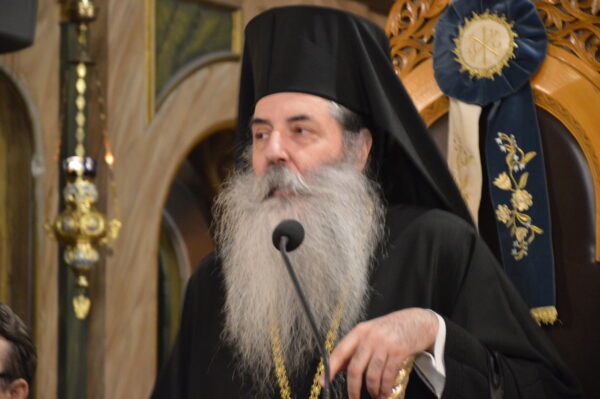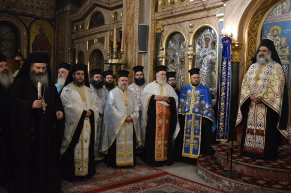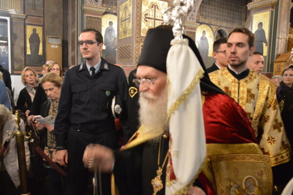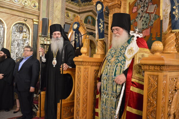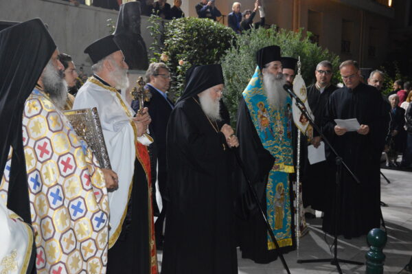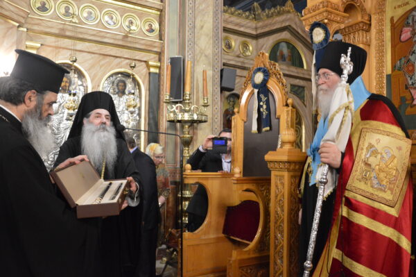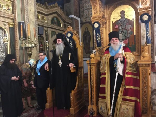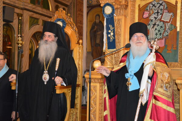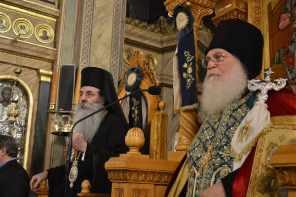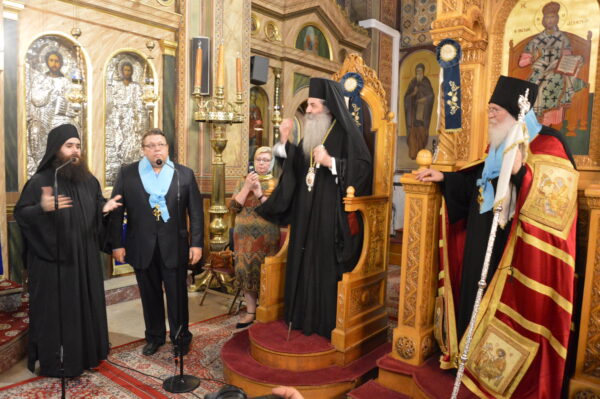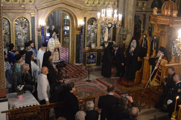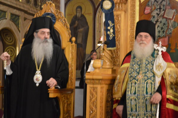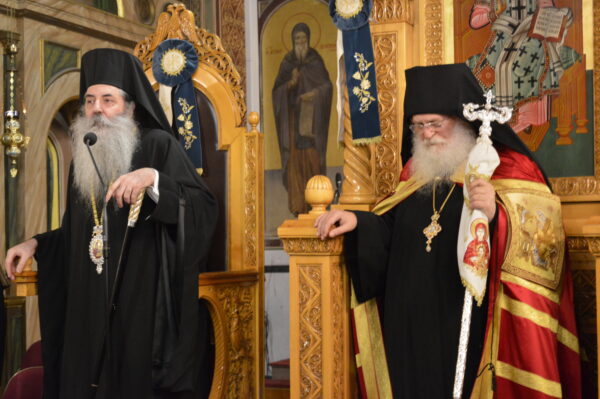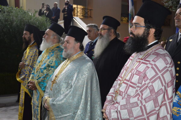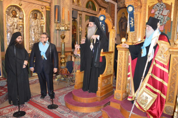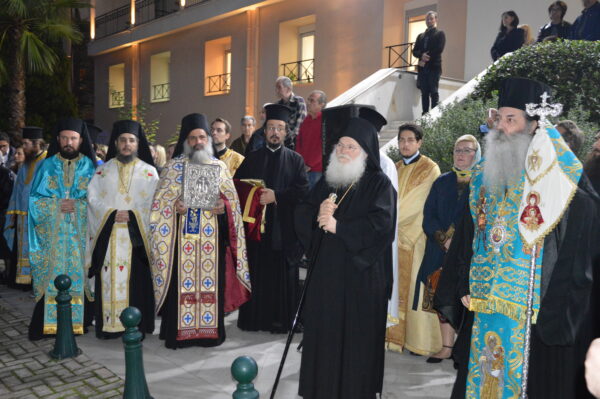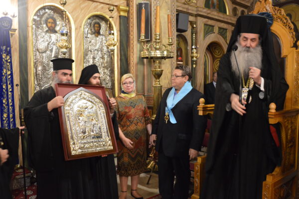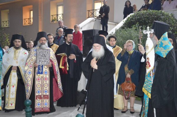 Μετά την υποδοχή της σεβάσμιας Εικόνας ο Σεβασμιώτατος κ. Σεραφείμ αναφέρθηκε με εγκάρδια λόγια προς τον Γέροντα Εφραίμ τονίζοντας: ” Δόξα τω Θεώ. Αισθανόμεθα ότι δεν είμαστε μόνοι. Ότι οι ευχές σας, η αγάπη σας, μας στηρίζουν σε αυτόν τον ανηφορικό δρόμο της καθημερινότητός μας μέσα στο λεκανοπέδιο αυτό των Αθηνών. Το πρώτο λιμάνι της χώρας, με το ετερόκλιτο πλήθος που διέρχεται καθημερινώς, καλείται να επιτελέσει ένα μεγάλο έργο πίστεως, αληθείας, προσφορά, ζωής και ευθύνης», είπε σε άλλο σημείο ο Σεβασμιώτατος, αναφερόμενος παράλληλα και στις 7.500 μερίδες φαγητού που προσφέρει σε καθημερινή βάση η τοπική μας Εκκλησία. Σε όλα είστε ο Κυρηναίος της πίστεως», προσφέροντας στον Γέροντα Εφραίμ ως μικρό αντίδωρο της αγάπης του, τον Χρυσό Σταυρό της Ευαγγελιστρίας Πειραιώς, ενώ ως ενθύμιο της παρουσίας του, του δώρισε μία ράβδο. «Πάντοτε προσκυνούντες την Ιερά Εικόνα την οποία η αγάπη τους μας προσέφερε, η προσευχή μας και η αγάπη μας θα κατευθύνονται προς την Ευλογημένη οικογένειά τους», είπε χαρακτηριστικά, πρσφέροντάς τους τον Χρυσό Σταυρό της Ευαγγελιστρίας.