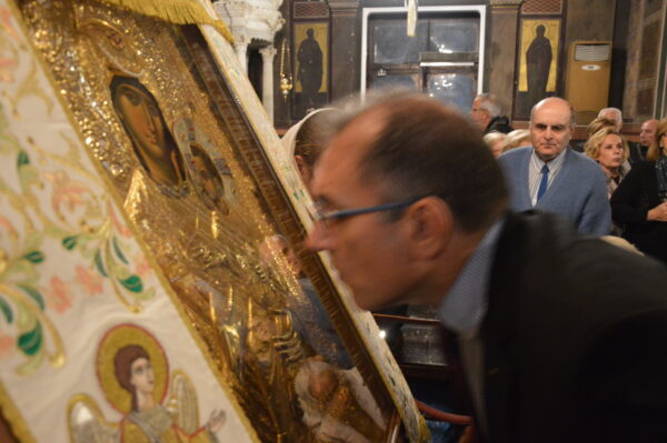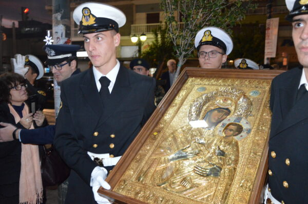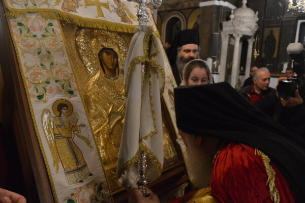 Την Ιερά Εικόνα κόμισε ο Καθηγούμενος της Ιεράς Μεγίστης Μόνης Βατοπαιδίου Γέροντας Εφραίμ και την υποδέχτηκε ο Σεβ. Μητροπολίτης Πειραιώς κ. Σεραφείμ, ο κλήρος της Μητροπόλεως και πλήθος πιστών.