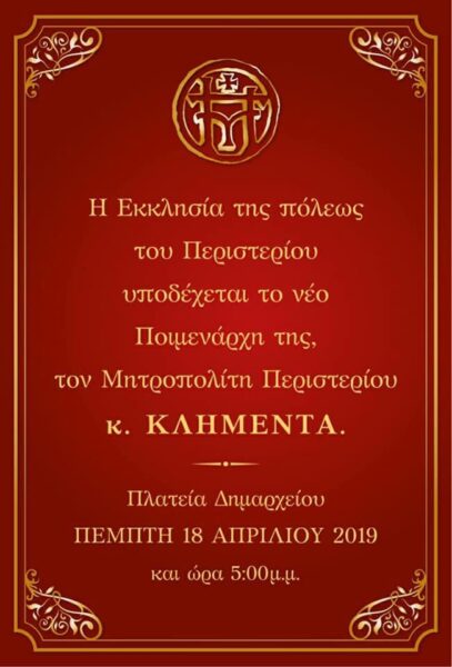 Η Εκκλησία της πόλεως του Περιστερίου υποδέχεται τον νέο Ποινεμάρχη της, εψηφισμένο Μητροπολίτη Περιστερίου, κ. Κλήμεντα, στην Πλατεία Δημαρχείου, κατά την Πέμπτη 18 Απριλίου 2019 και ώρα 5.00 μ.μ.
