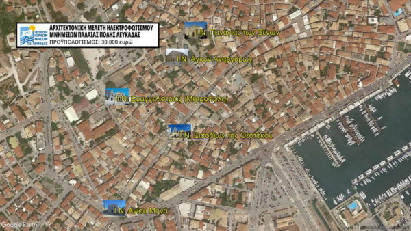 Η σχετική Σύμβαση για την εκπόνηση «Αρχιτεκτονικής Μελέτης Ηλεκτροφωτισμού Μνημείων Παλαιάς Πόλης Λευκάδας» υπεγράφη από την Περιφερειάρχη Ιονίων Νήσων, Ρόδη Κράτσα – Τσαγκαροπούλου, έχει προϋπολογισμό 30.000 ευρώ, χρηματοδοτείται από το αποθεματικό (ΚΑΠ) της Π.Ε. Λευκάδας και αφορά στην ανάδειξη, μέσω κατάλληλου αρχιτεκτονικού φωτισμού των προσόψεων και του περιβάλλοντος χώρου, των παρακάτω μνημείων, τα οποία κρίθηκαν ότι αποτελούν αντιπροσωπευτικό δείγμα της αρχιτεκτονικής κληρονομιάς της Λευκάδας: