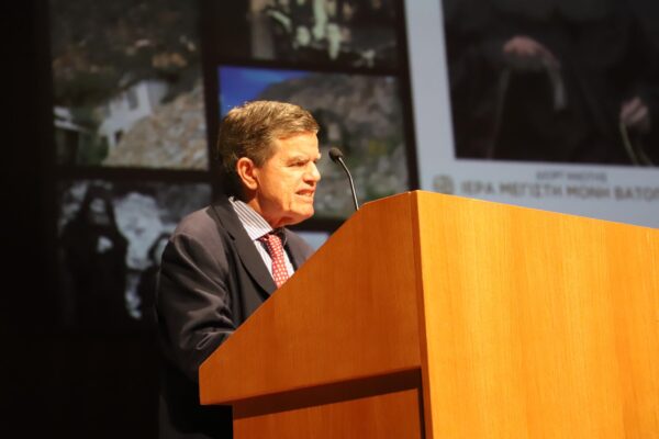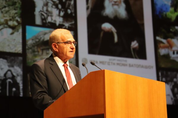 Ο κ. Διαματάρης εκπροσώπησε τον Πρωθυπουργό Κυριάκο Μητσοτάκη, ενώ στο χαιρετισμό του αναφέρθηκε στην προσωπικότητα του Γέροντα Ιωσήφ του Ησυχαστού τονίζοντας: “Αυτός ο Γέροντας, όπως διαπίστωσα και από τις επισκέψεις μου στο Άγιον Όρος, είναι ένας από τους σύγχρονους Αγιορείτες Αγίους, που με την ζωή και την παρουσία του βοήθησε πολύ και μοναχούς και λαϊκούς στην άσκηση της προσευχής και με τα πνευματικά του παιδιά ανανέωσε το έμψυχο και άψυχο υλικό στο Περιβόλι της Παναγία”.