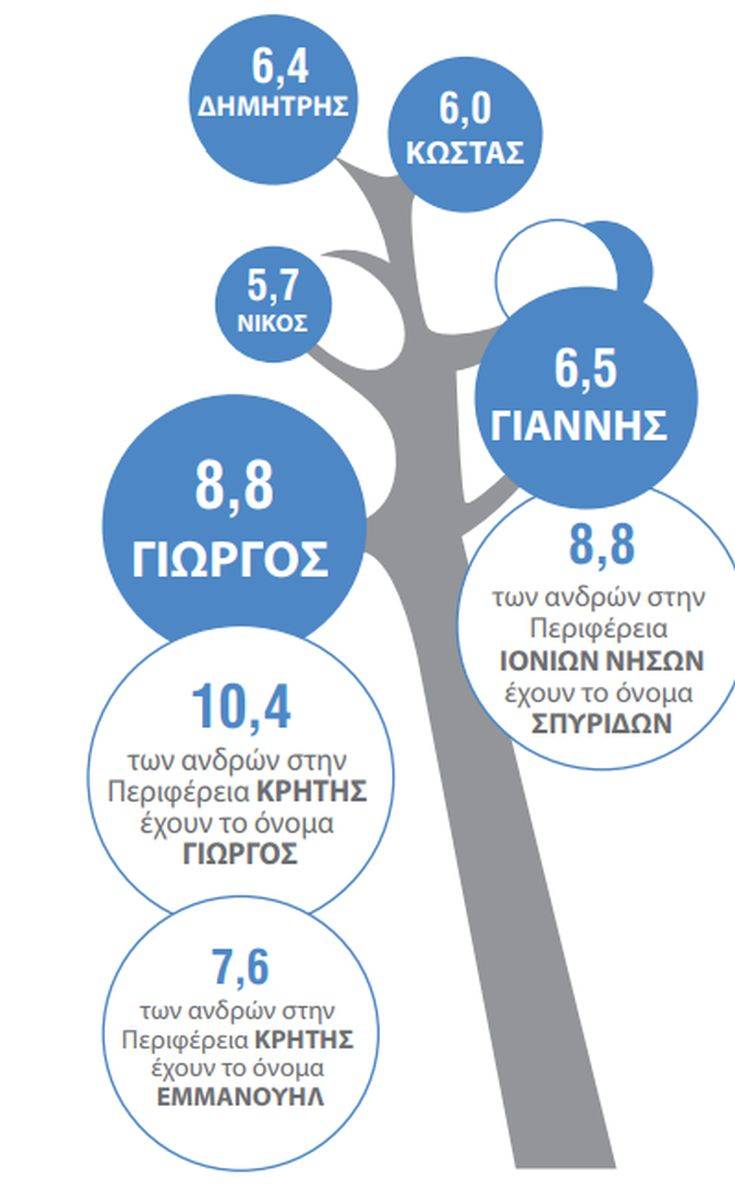 Όσον αφορά στους άνδρες, το πιο δημοφιλές όνομα είναι το Γιώργος, με ποσοστό 8,8% του ανδρικού πληθυσμού. Ακολουθεί το Γιάννης με 6,5%,το Δημήτρης με 6,4%, το Κώστας με 6% και το Νίκος με 5,7%.