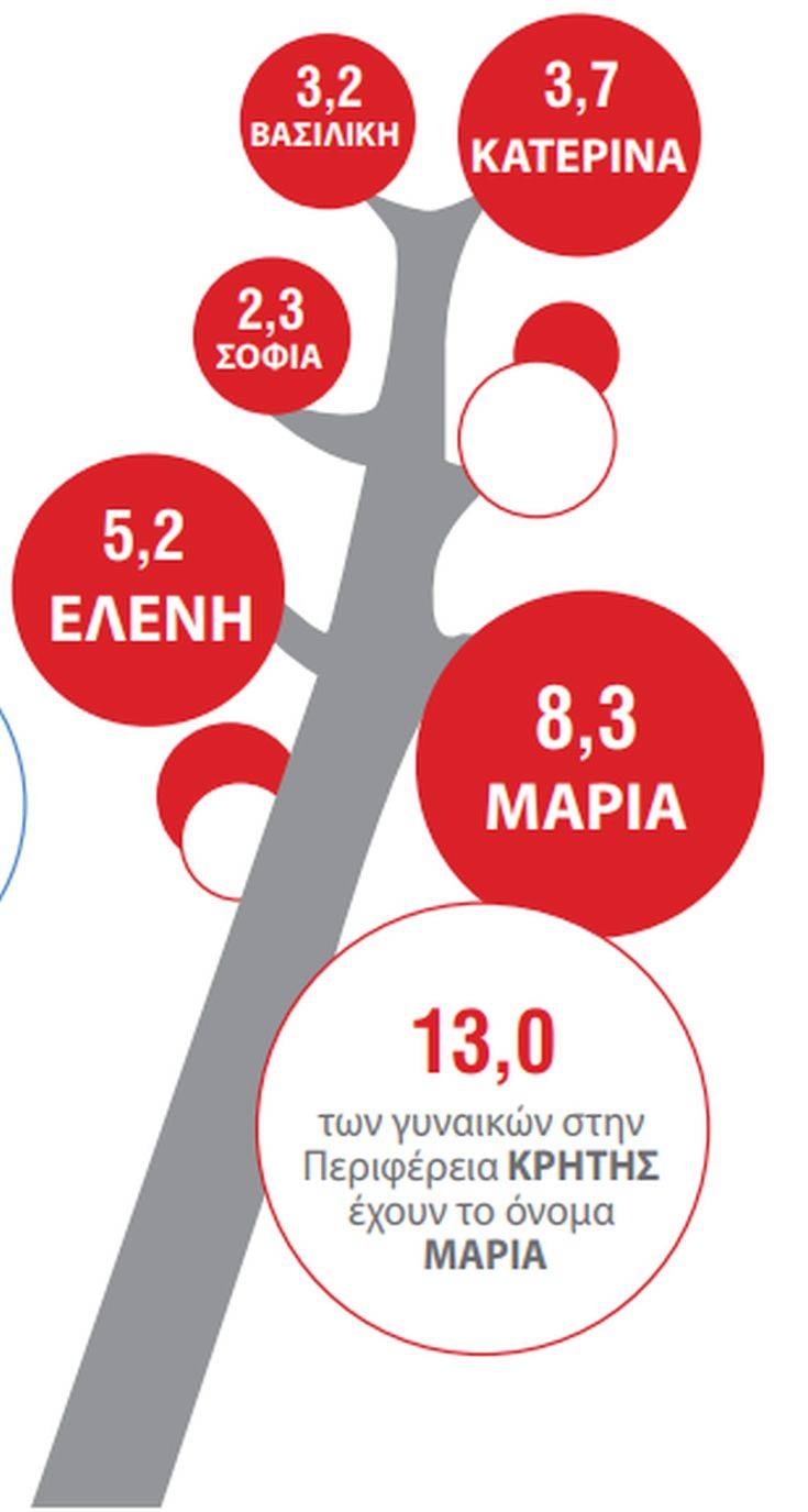 Το Μαρία είναι επίσης μακράν το δημοφιλέστερο όνομα στην περιφέρεια Κρήτης, με ποσοστό 13%.
