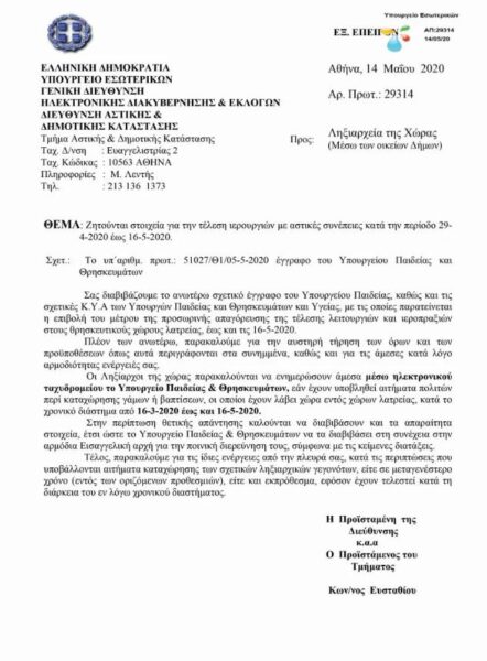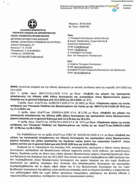 Σύμφωνα με αυτό οι ληξίαρχοι της χώρας καλούνται να ενημερώσουν άμεσα το υπουργείο Παιδείας και Θρησκευμάτων μέσω ηλεκτρονικού ταχυδρομείου, εάν έχουν υποβληθεί αιτήματα πολιτών περί καταχώρησης γάμων ή βαπτίσεων, οι οποίοι έχουν τελεσθεί σε χώρους λατρείας, κατά το χρονικό διάστημα από 16-3 2020 έως 16-5-2020.