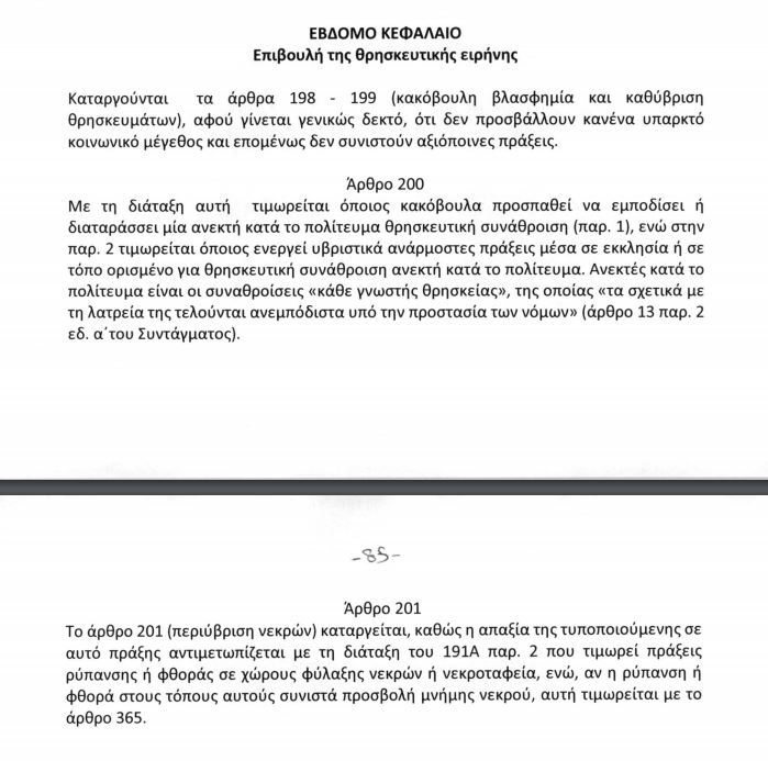 Το σχέδιο νόμου κατατέθηκε προχθές στη Βουλή με αρκετές τροποποιήσεις, μετά τη διαβούλευση στις οποίες ωστόσο φαίνεται ότι διατηρείται η κατάργηση των άρθρων περί βλασφημίας θρησκειών, και περιύβριση νεκρών.