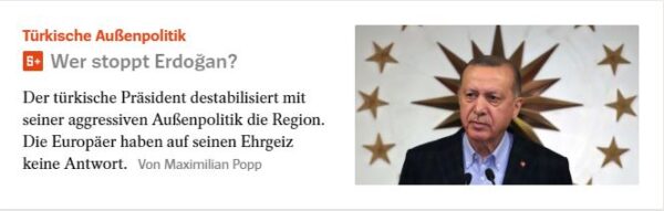 Όπως σημειώνει η DW, η ανάλυση του περιοδικού Spiegel, με τίτλο «Ποιος θα σταματήσει τον Ερντογάν;», αναφέρεται στη νέα φάση της επιθετικής εξωτερικής πολιτικής του Ρετζέπ Ταγίπ Ερντογάν, που θέλει απεγνωσμένα να δείξει ότι «η κληρονομιά του Ατατούρκ έχει ξεπεραστεί» (αφού εκείνος μετέτρεψε την Αγία Σοφία σε μουσείο, αλλά και υπέγραψε τη συνθήκη της Λωζάνης) και ότι ο ίδιος «δεν αναγνωρίζει πλέον τα υπάρχοντα σύνορα».