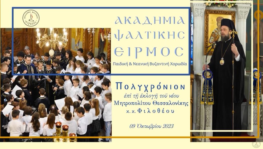 Η Ακαδημία Ψαλτικής Ειρμός ευφραίνεται, αγάλλεται και χαίρει επί τη εκλογή του νέου Ποιμενάρχου της τοπικής Αποστολικής Εκκλησίας των Θεσσαλονικέων και τα παιδιά της ερμηνεύουν με χαρά και ενθουσιασμό σύντομο «Πολυχρόνιον» σε Ήχο Δεύτερο, εις τον παναγιώτατον Μητροπολίτην Θεσσαλονίκης Φιλόθεον, τον από Ωρεών: