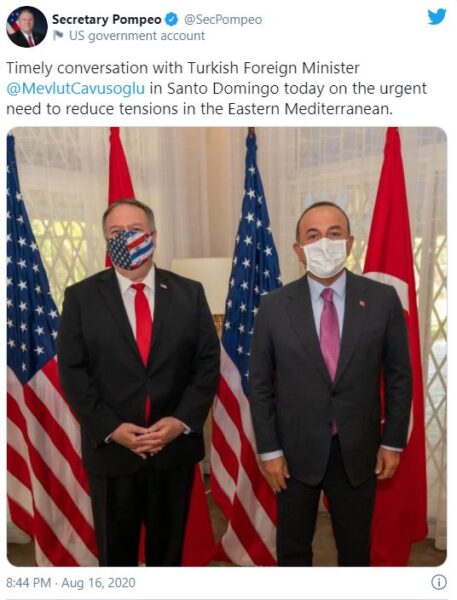 Ο υπουργός Εξωτερικών των ΗΠΑ Μάικλ Πομπέο συναντήθηκε σήμερα με τον υπουργό Εξωτερικών της Τουρκίας Μεβλούτ Τσαβούσογλου στο Σάντο Ντομίνγκο, στη Δομινικανή Δημοκρατία, όπως έγινε γνωστό από το Στέιτ Ντιπάρτμεντ.