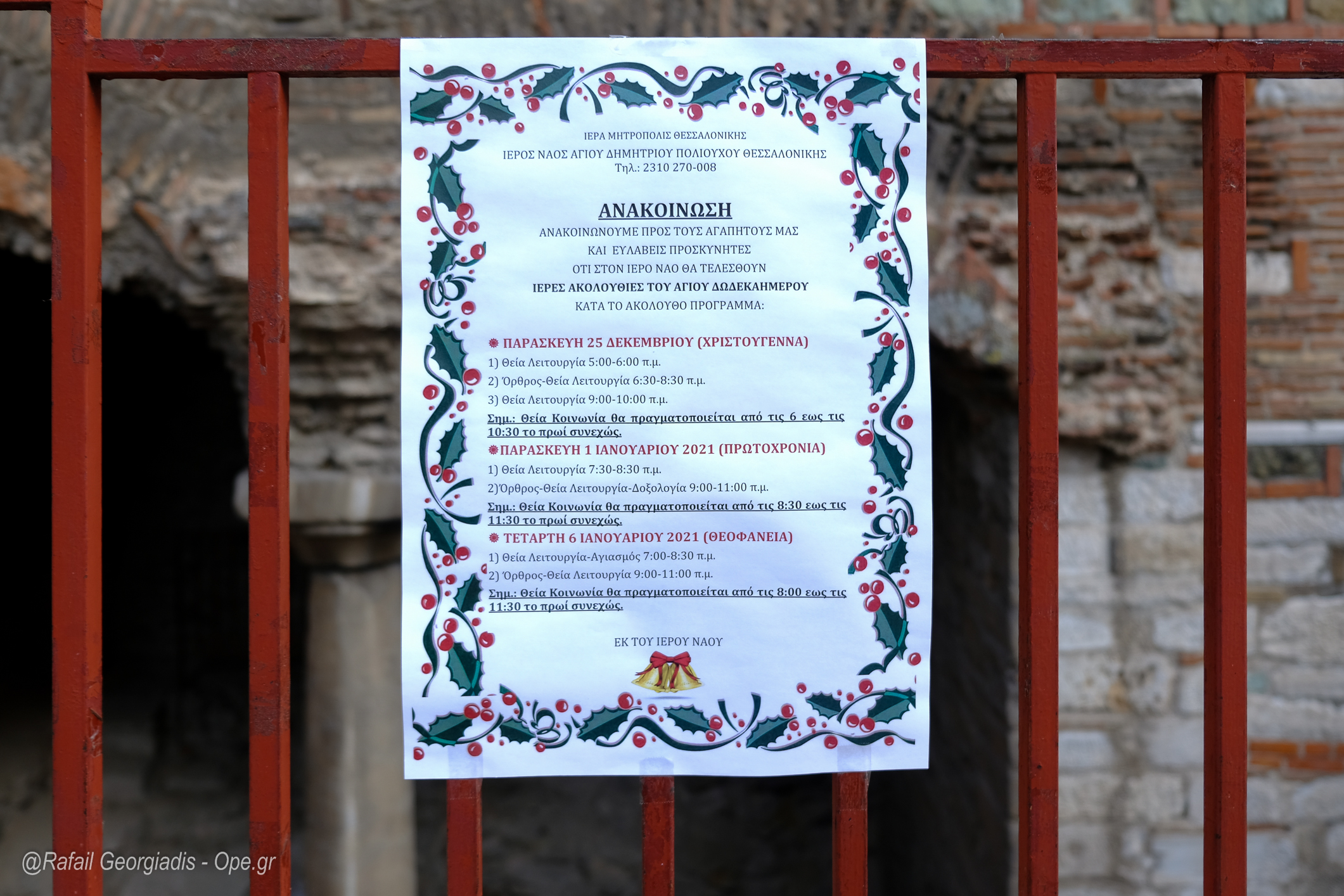 Έξω από κάθε ναό θα είναι αναρτημένος ο συνολικός αριθμός των πιστών , που μπορούν να βρίσκονται ταυτοχρόνως εντός του ναού, το ωράριο τέλεσης των λειτουργιών τις συγκεκριμένες ημερομηνίες, αλλά και το ωράριο κατά το οποίο ο Ιερός Ναός θα παραμένει ανοικτός για την προσέλευση των πιστών για ατομική προσευχή και προσκύνηση