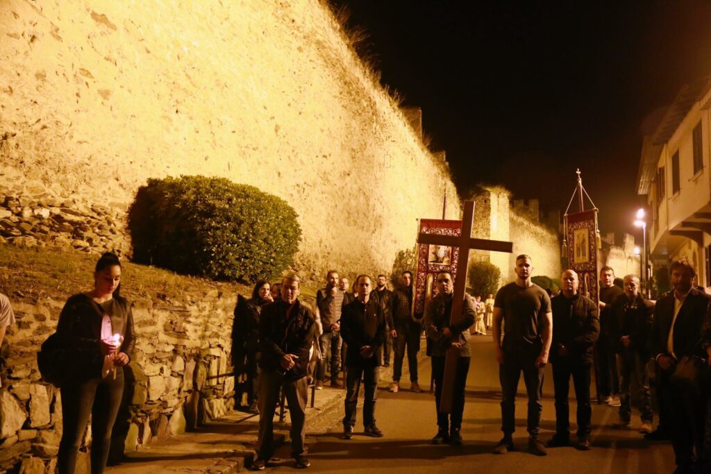 Η λιτανεία του Επιταφίου πραγματοποιήθηκε δίπλα από τα βυζαντινά τείχη και ανάμεσα στα πλακόστρωτα παραδοσιακά σοκάκια της άνω Πόλης με το πλήθος του κόσμου να καταφτάνει από διαφορα μέρη της Θεσσαλονικης για να παραβρεθεί στην λιτανεία.