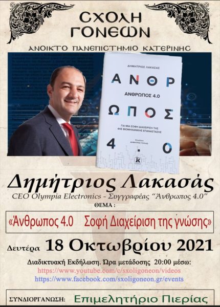 Ο C.E.O. της Olympia Electronics κ. Δημήτριος Λακασάς ανοίγει την πρεμιέρα της 33ης Ακαδημαϊκής χρονιάς για το 2021-2022 της Σχολής Γονέων – Ανοικτό Πανεπιστήμια Κατερίνης την προσεχή Δευτέρα 18-10-2021 στις 20:00. Το θέμα της ομιλίας του είναι: «Άνθρωπος 4.0 Σοφή διαχείριση της γνώσης».