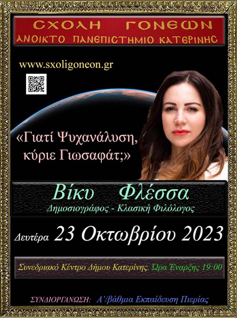 Με την γνωστή στο Πανελλήνιο δημοσιογράφο – Κλασική Φιλόλογο κ. Βίκυ Φλέσσα ξεκινάει το φετινό ταξίδι της για 35η χρονιά η Σχολή Γονέων – Ανοικτό Πανεπιστήμιο Κατερίνης την Δευτέρα 23 Οκτωβρίου 2023 και ώρα 19:00 στο Συνεδριακό Κέντρο Κατερίνης.