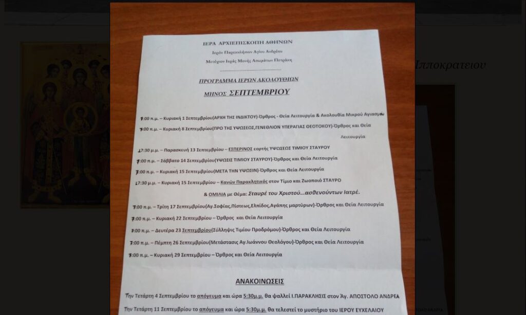 Πρόγραμμα Ιερών Ακολουθιών, μηνός Σεπτεμβρίου 2019, εις το Ιερόν Παρεκκλήσιον Αγίου Ανδρέου Ιπποκρατείου, Μετοχίου της Ι.Μ. Ασωμάτων Πετράκη, καθώς αυτό επισυνάπτεται.