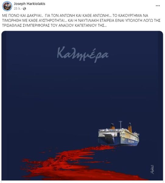 Ο έλκων την καταγωγή του από το Λασίθι Ιεράρχης του Οικουμενικού Θρόνου σε σημερινή του ανάρτησή έγραψε: “ΜΕ ΠΟΝΟ ΚΑΙ ΔΑΚΡΥΑ!.. ΓΙΑ ΤΟΝ ΑΝΤΩΝΗ ΚΑΙ ΚΑΘΕ ΑΝΤΩΝΗ!… ΤΟ ΚΑΚΟΥΡΓΗΜΑ ΝΑ ΤΙΜΩΡΗΘΗ ΜΕ ΚΑΘΕ ΑΥΣΤΗΡΟΤΗΤΑ!… ΚΑΙ Η ΝΑΥΤΙΛΙΑΚΗ ΕΤΑΙΡΕΙΑ ΕΙΝΑΙ ΥΠΟΛΟΓΗ ΛΟΓΩ ΤΗΣ ΤΡΙΣΑΘΛΙΑΣ ΣΥΜΠΕΡΙΦΟΡΑΣ ΤΟΥ ΑΝΑΞΙΟΥ ΚΑΠΕΤΑΝΙΟΥ ΤΗΣ…”