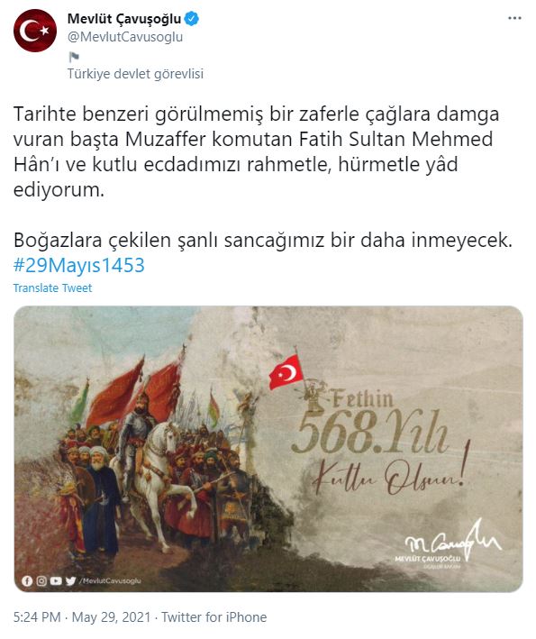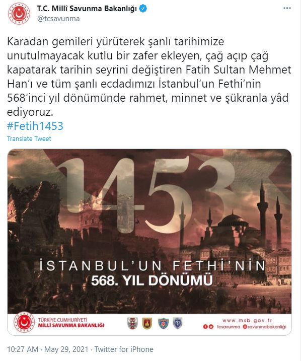 İstanbul’un fethinin 568. yıl dönümünü kutluyor, Fatih Sultan Mehmet Han ile bu toprakları bizlere vatan kılan tüm şehitlerimizi saygı ve rahmetle anıyoruz.#Fetih1453#istanbulunfethi pic.twitter.com/AGi1pFKJsL