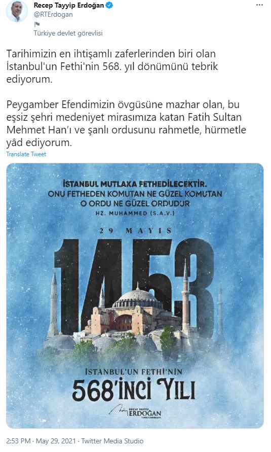 «Χρόνια πολλά για την 568η επέτειο της κατάκτησης της Κωνσταντινούπολης, μιας από τις πιο ένδοξες νίκες στην ιστορία μας. Τιμούμε τον σουλτάνο Μωάμεθ, ο οποίος με την ευλογία του προφήτη κληροδότησε τον πολιτισμό στη μοναδική αυτή πόλη. Ο Μωάμεθ είπε ότι η Κωνσταντινούπολη σίγουρα θα κατακτηθεί. Τι σπουδαίος στρατηγός ο στρατηγός που θα την κατακτήσει, πόσο μεγάλος στρατός είναι αυτός ο στρατός», έγραψε στο μήνυμα του ο Ερντογάν και δημοσίευσε φωτογραφία της Αγίας Σοφίας ως τζαμί, με τους 4 μιναρέδες.