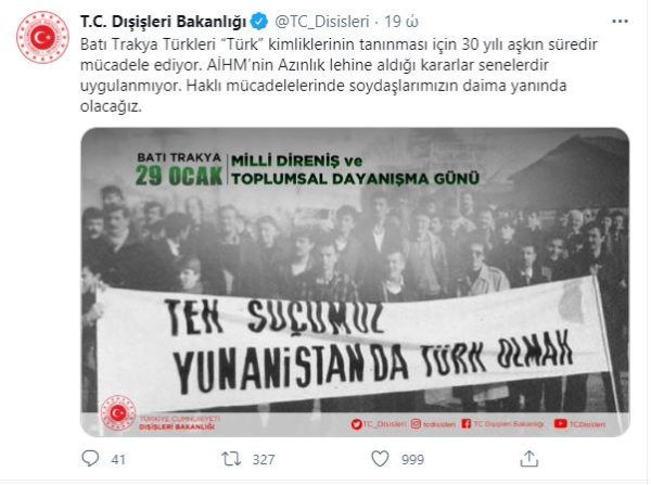 Συγκεκριμένα το Υπουργείο Εξωτερικών της Τουρκίας ανέφερε πως η Ελλάδα αγνοεί τις αποφάσεις του Ευρωπαϊκού Δικαστηρίου Ανθρωπίνων Δικαιωμάτων και θέτει θέμα για καταπίεση της μειονότητας της Δυτικής Θράκης. Με ανάρτηση στα Μέσα Κοινωνικής Δικτύωσης που έκανε χτες, Παρασκευή, αργά το απόγευμα αναφέρει ότι η 29η Ιανουαρίου είναι για τη Δυτική Θράκη η Ημέρα Εθνικής Αντίστασης και Κοινωνικής Αλληλεγγύης ενώ η ανάρτηση του Τουρκικού ΥΠΕΞ σημειώνει “οι Τούρκοι της Δυτικής Θράκης αγωνίζονται για περισσότερα από 30 χρόνια για την αναγνώρισης της τουρκικής ταυτότητας τους. Οι αποφάσεις του Ευρωπαϊκού Δικαστηρίου Ανθρωπίνων Δικαιωμάτων υπέρ της μειονότητας δεν έχουν εφαρμοστεί επί σειρά ετών. Θα στεκόμαστε πάντα στο πλευρό των ομοεθνών μας στους δίκαιους αγώνες τους».