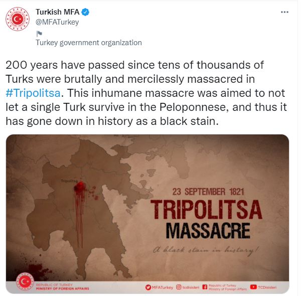 Το τουρκικό ΥΠΕΞ, μάλιστα, δημιούργησε και χάρτη της Πελοποννήσου, με αίμα να φαίνεται να ρέει από μια πινέζα στο σημείο όπου βρίσκεται η Τριπολιτσά (!) “23 Σεπτεμβρίου 1821. Σφαγή της Τριπολιτσάς. Μια μαύρη κηλίδα στην ιστορία!” γράφει ο χάρτης…
