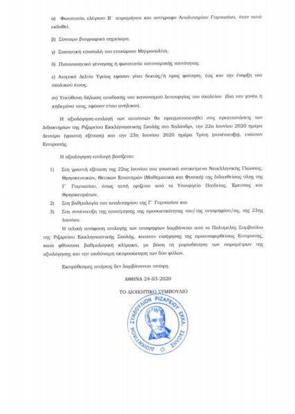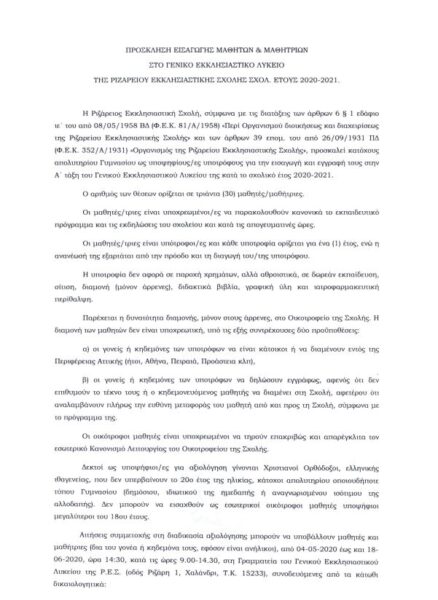 ΠΡΟΣΚΛΗΣΗ ΕΙΣΑΓΩΓΗΣ ΜΑΘΗΤΩΝ ΚΑΙ ΜΑΘΗΤΡΙΩΝ (ΛΥΚΕΙΟ) ΡΙΖΑΡΕΙΟΥ ΕΚΚΛΗΣΙΑΣΤΙΚΗΣ ΣΧΟΛΗΣ ΓΙΑ ΤΟ ΣΧΟΛΙΚΟ ΕΤΟΣ 2020-2021, την οποία μπορείτε να διαβάσετε αναλυτικά ΕΔΩ