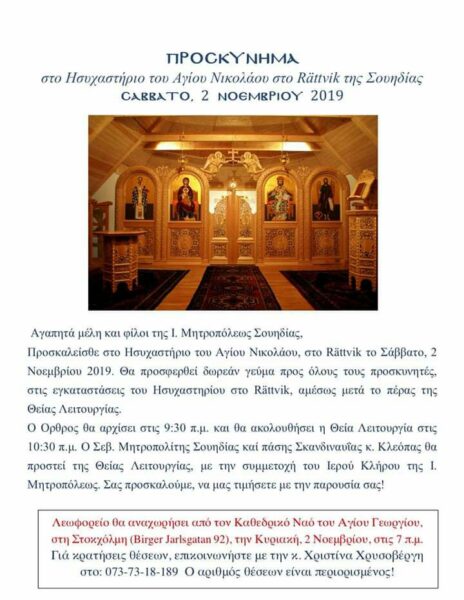 Προσκαλείσθε στο Ησυχαστήριο του Αγίου Νικολάου, στο Rättvik το Σάββατο, 2 Νοεμβρίου 2019. Θα προσφερθεί δωρεάν γεύμα προς όλους τους προσκυνητές, στις εγκαταστάσεις του Ησυχαστηρίου στο Rättvik, αμέσως μετά το πέρας της Θείας Λειτουργίας.