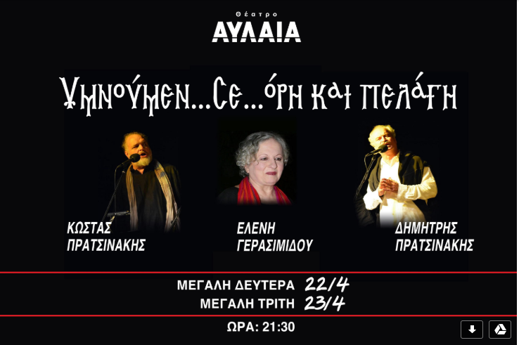 Μία πρωτότυπη μουσική παράσταση, ειδικά για το κατανυχτικό ύφος της Μεγάλης Εβδομάδας, θα παρουσιαστεί στο Θέατρο Αυλαία, την Μεγάλη Δευτέρα 22 και Μεγάλη Τρίτη 23 Απριλίου, από τους Κώστα Πρατσινάκη, Ελένη Γερασιμίδου& Δημήτρη Πρατσινάκη, με συνοδεία από ζωντανούς μουσικούς.
