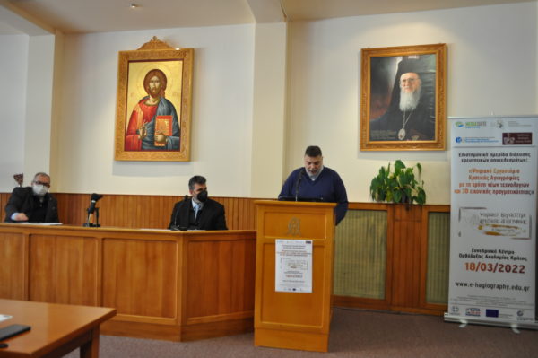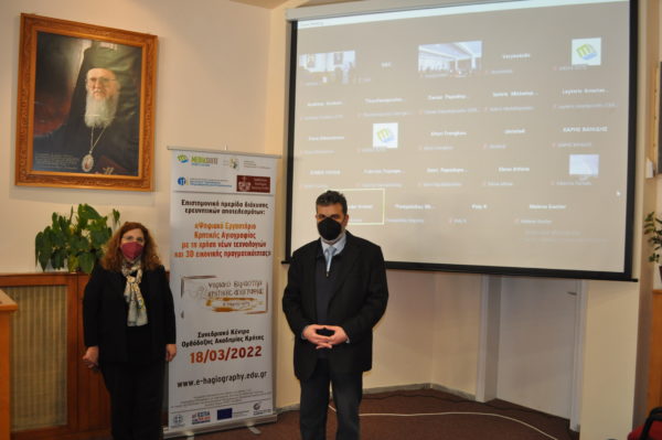 Με ιδιαίτερη επιτυχία και μεγάλη συμμετοχή πραγματοποιήθηκε την Παρασκευή 18 Μαρτίου 2022 η Επιστημονική Ημερίδα διάχυσης ερευνητικών αποτελεσμάτων, με τίτλο: «Ψηφιακό Εργαστήρι Κρητικής Αγιογραφίας με τη χρήση νέων τεχνολογιών και 3D εικονικής πραγματικότητας, e-hagiography».