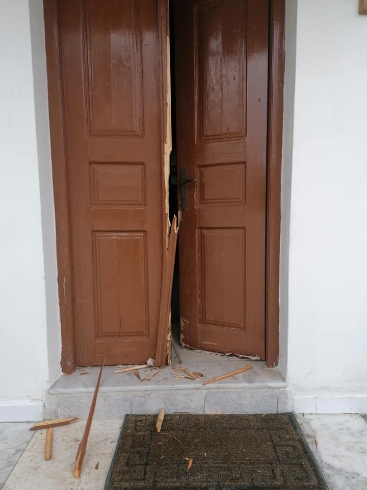 Ο Άγιος Ραφαήλ σήμερα στη Μόρια με θρυμματισμένη την ξύλινη πόρτα και ζημιές στο εσωτερικό.