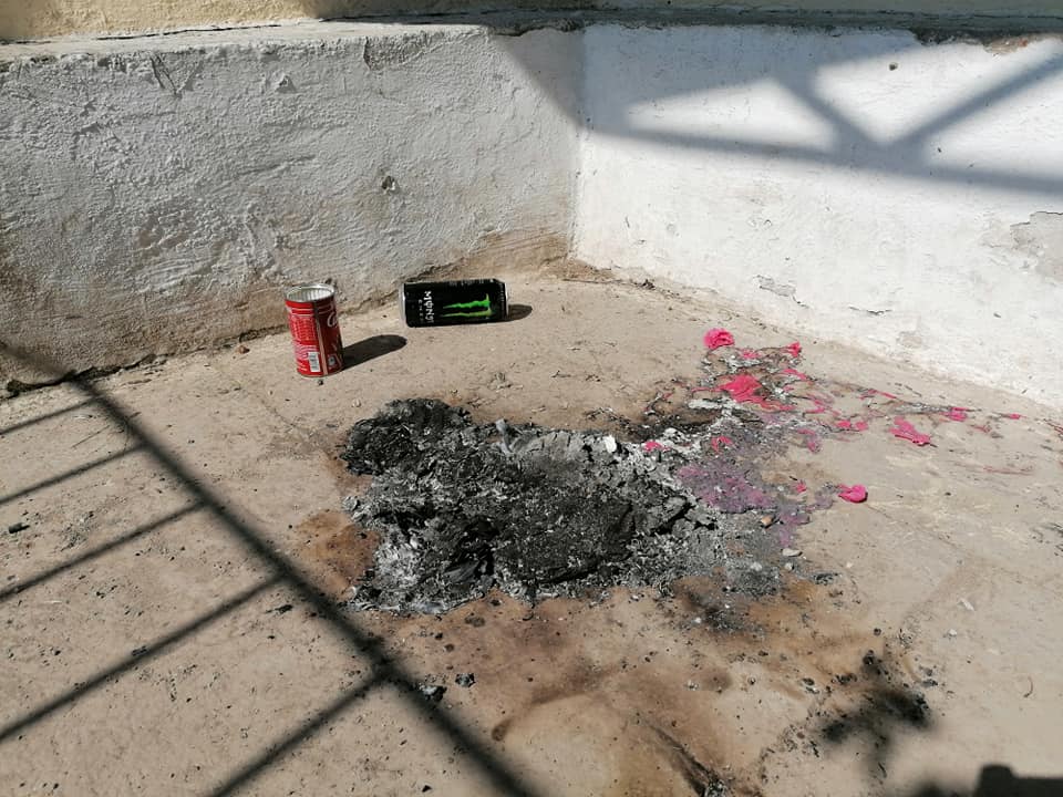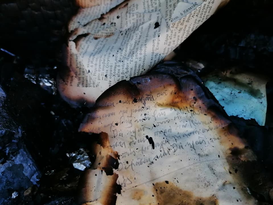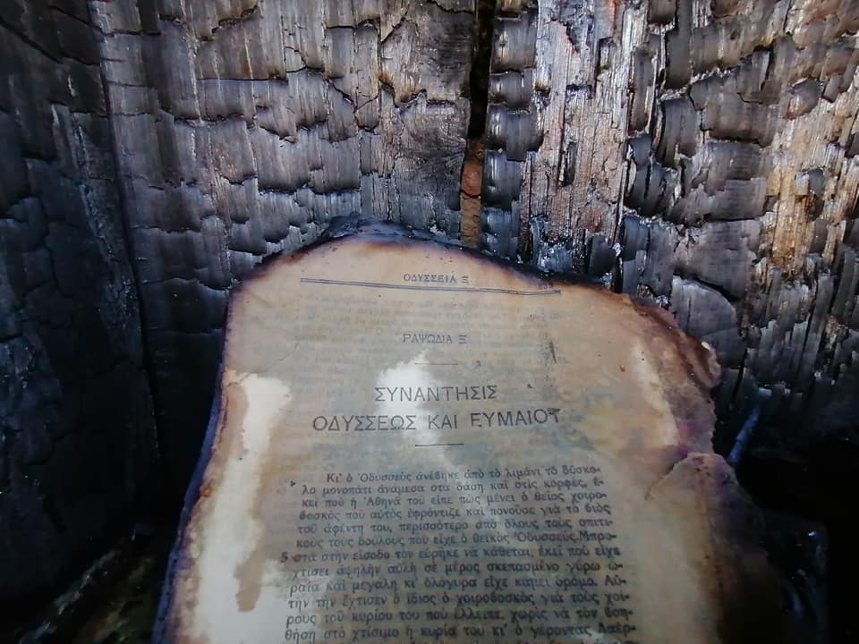 Από την οργή των βανδάλων δεν γλίτωσε ότι το ιστορικό κτήριο του 1868 στη Μόρια: Οι παλιοί στάβλοι του Ελευθεριάδη, με τα ξύλινα ράφια γεμάτα βιβλία και χειρόγραφες σημειώσεις που δε θα διαβαστούν ποτέ.