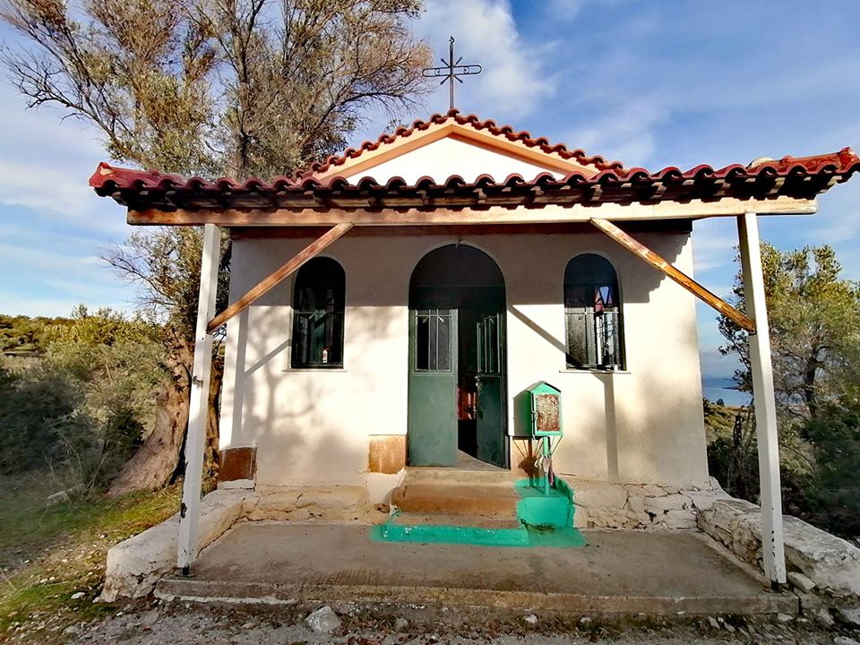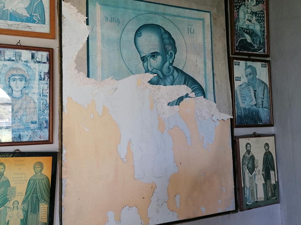 Ο Άγιος Ραφαήλ σήμερα στη Μόρια με θρυμματισμένη την ξύλινη πόρτα και ζημιές στο εσωτερικό.