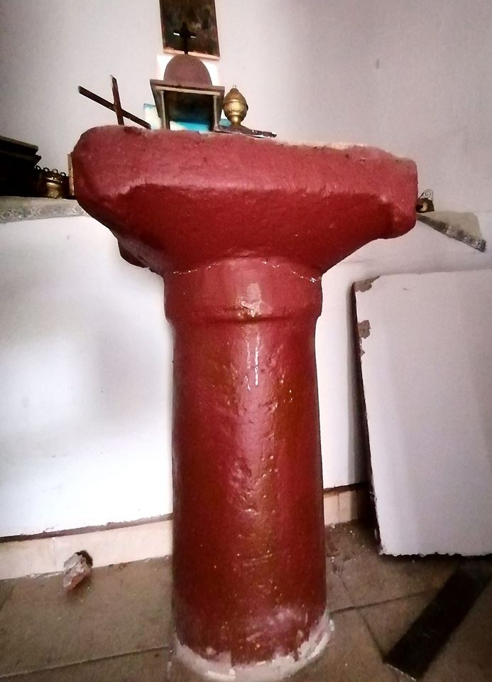 Η Αγία Τράπεζα στον λεηλατημένο Άγιο Γεώργιο της Μόριας είναι ένας ανεστραμμένος αρχαίος βωμός.