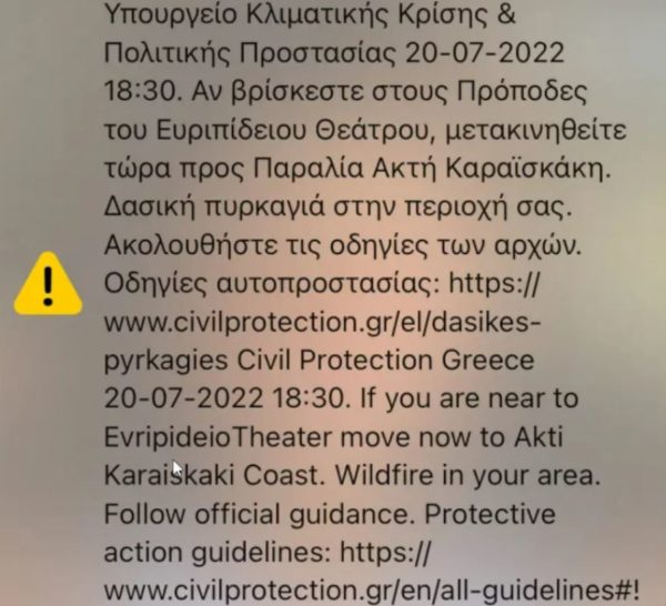 Περί τις 18:45 στάλθηκε μήνυμα από το 112 που καλεί τους πολίτες να εκκενώσουν τους Πρόποδες του Ευριπίδειου Θεάτρου και να κινηθούν προς την Παραλία της Ακτής Καραϊσκάκη.