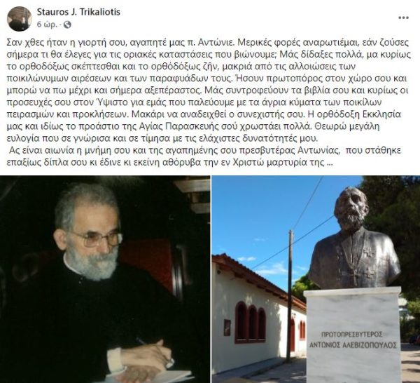 “Μάς δίδαξες πολλά, μα κυρίως το ορθοδόξως σκέπτεσθαι και το ορθόδόξως ζην, μακριά από τις αλλοιώσεις των ποικιλώνυμων αιρέσεων και των παραφυάδων τους. Ήσουν πρωτοπόρος στον χώρο σου και μπορώ να πω μέχρι και σήμερα αξεπέραστος. Μάς συντροφεύουν τα βιβλία σου και κυρίως οι προσευχές σου στον Ύψιστο για εμάς που παλεύουμε με τα άγρια κύματα των ποικίλων πειρασμών και προκλήσεων. Μακάρι να αναδειχθεί ο συνεχιστής σου. Η ορθόδοξη Εκκλησία μας και ιδίως το προάστιο της Αγίας Παρασκευής σού χρωστάει πολλά. Θεωρώ μεγάλη ευλογία που σε γνώρισα και σε τίμησα με τις ελάχιστες δυνατότητές μου. Ας είναι αιωνία η μνήμη σου και της αγαπημένης σου πρεσβυτέρας Αντωνίας, που στάθηκε επαξίως δίπλα σου κι έδινε κι εκείνη αθόρυβα την εν Χριστώ μαρτυρία της”.
