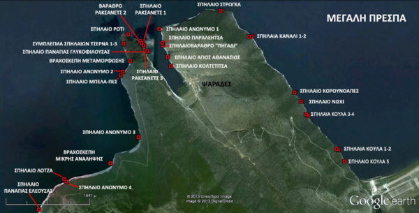 Η κ. Μιχελάκη εξήγησε ότι τις τελευταίες δεκαετίες η σημαντική πτώση της στάθμης της λίμνης στη Μεγάλη Πρέσπα έχει ως αποτέλεσμα «να αποκαλυφθούν πολλά σπήλαια που δεν ήταν καθόλου γνωστά ή άλλα που δεν γνωρίζαμε τις πραγματικές τους διαστάσεις» καθότι το μεγαλύτερο μέρος τους κατακλυζόταν από νερά. Είναι κατανεμημένα στις δύο πλευρές του κόλπου των Ψαράδων και εκτείνονται δυτικά έως τα ελληνοαλβανικά σύνορα και ανατολικά έως στο φυλάκιο της Κούλας. Οι αρχαιολόγοι αναφέρουν ότι πρόκειται για οριζόντια σπήλαια, εκτός των «Πηγάδι» και «Ράκσανετς 2» τα οποία είναι μεγάλα σπηλαιοβάραθρα.