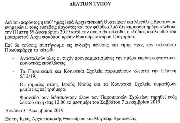 2.00 μμ: Τό σκήνωμα τοῦ Μακαριστοῦ Ἀρχιεπισκόπου θά τεθῇ εἰς λαϊκόν προσκύνημα εἰς τόν Καθεδρικόν Ναόν Κοιμήσεως Θεοτόκου Βορείου Λονδίνου, Wood Green ἕως τήν 8ην πρωϊνήν τῆς Πέμπτης 5ης Δεκεμβρίου 2019.