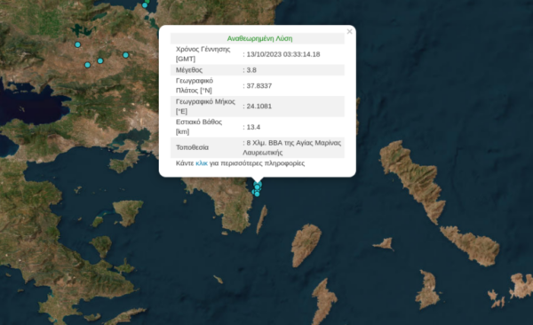 Σεισμική δόνηση μεγέθους 3,8 Ρίχτερ έγινε αισθητή στην περιοχή της Αττικής στις 6.33 το πρωί με επίκεντρο 8 χλμ. ΒΒΑ της Αγίας Μαρίνας Λαυρεωτικής. Το εστιακό βάθος εντοπίζεται στα 13 χλμ.