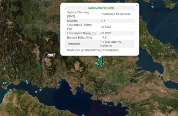 Νέα σεισμική δόνηση μεγέθους 4,1 βαθμών της κλίμακας Ρίχτερ σημειώθηκε λίγο μετά τη 1 το μεσημέρι του Σαββάτου με επίκεντρο την Αταλάντη.