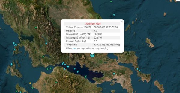 Σεισμική δόνηση 4,8 Ρίχτερ σημειώθηκε στην Αταλάντη το μεσημέρι της Πέμπτης (8/6), η οποία έγινε αισθητή και στην Αττική αλλά και άλλες περιοχές της χώρας.