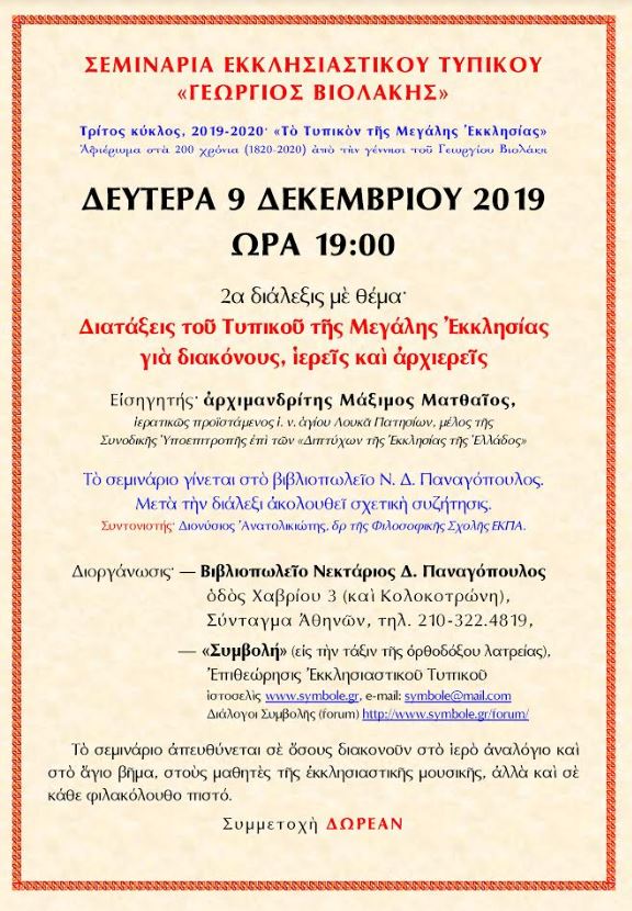 Την Δευτέρα 9 Δεκεμβρίου αναμένεται να πραγματοποιηθεί η δ δεύτερη διάλεξη του Τρίτου Κύκλου «Τὸ Τυπικὸν τῆς Μεγάλης ᾿Εκκλησίας» στο πλαίσιο του αφιερώματος για τα 200 χρόνια από τη γέννηση του Γεωργίου Βιολάκη.