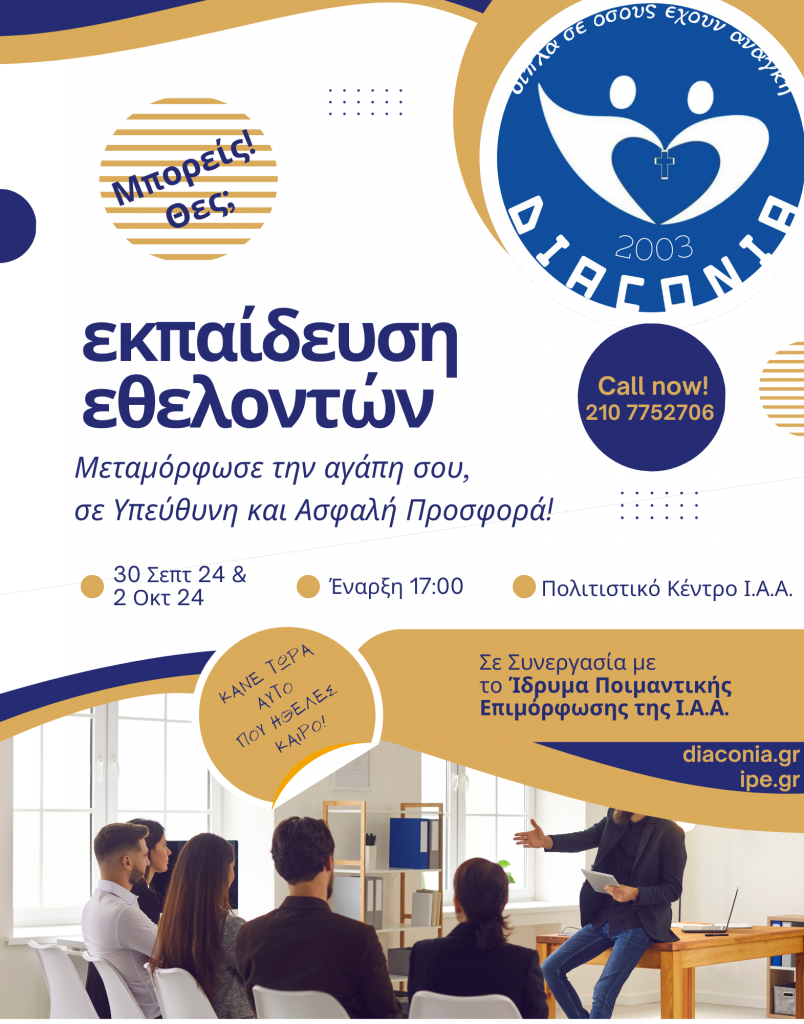 Η ΔΙΑΚΟΝΙΑ, έχοντας πολυετή εμπειρία στην εκπαίδευση εθελοντών, οργανώνει το πρώτο εκπαιδευτικό σεμινάριο για την περίοδο 2024 – 2025 για τους νέους εθελοντές της!