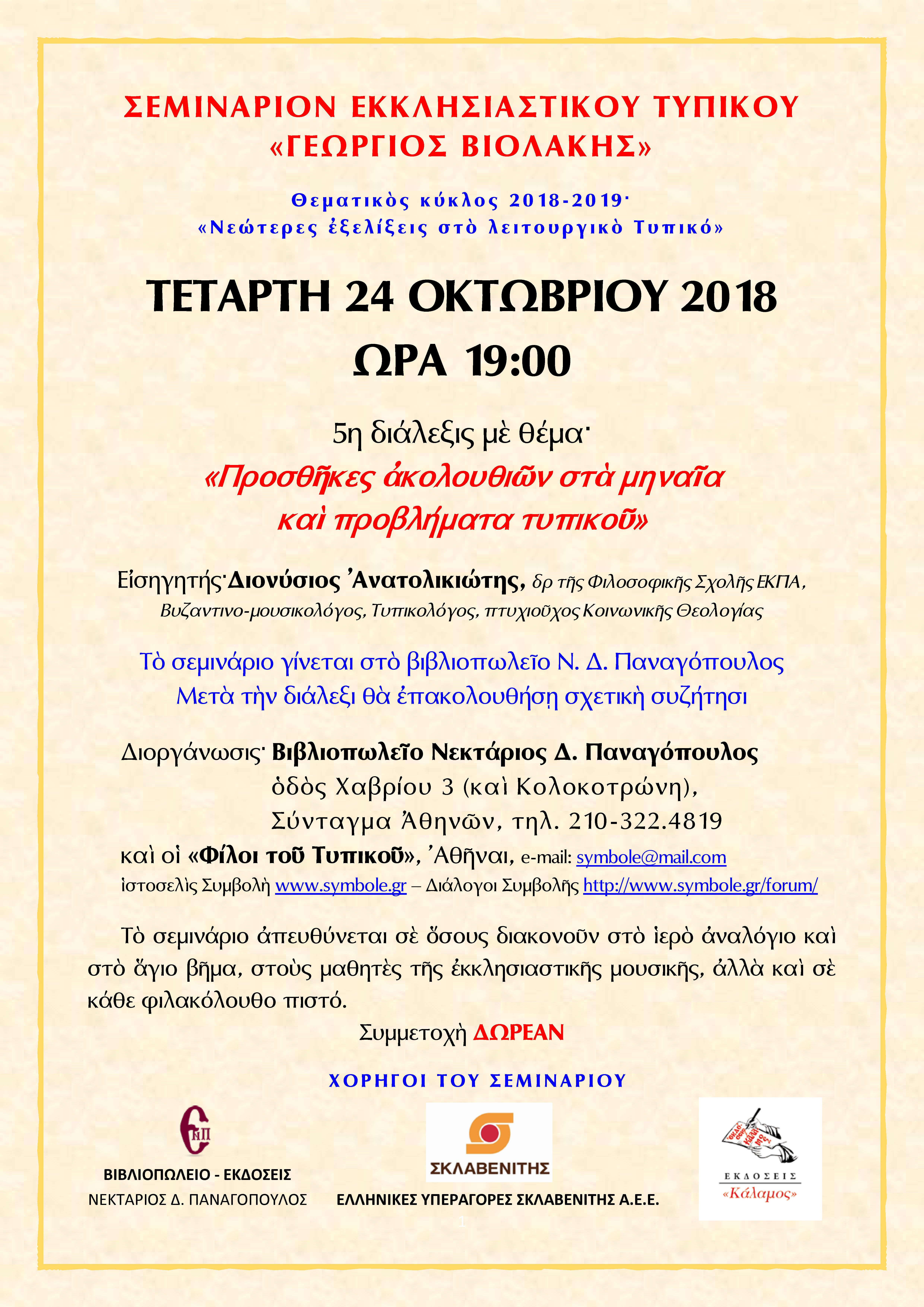Η 5η διάλεξη του σεμιναρίου Εκκλησιαστικού Τυπικού “Γέωργιος Βολάκης” στο πλαίσιο του θεματικού κύκλου “Νεώτερες Εξελίξεις στο Λειτουργικό Τυπικό“, αναμένεται να πραγματοποιηθεί την Τετάρτη 24 Οκτωβρίου και ώρα 19.00 στο βιβλιοπωλείο των εκδόσεων Ν. Παναγόπουλος (Χαβρίου και Κολοκοτρώνη, Αθήνα)