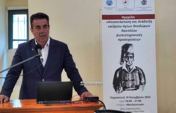 Ο Ιερός Ναός Αγίων Κωνσταντίνου και Ελένης Ναυπλίου, το τμήμα Αρχιτεκτόνων Μηχανικών του Πανεπιστημίου Θεσσαλίας (Π.Θ.) και ο Δήμος Ναυπλιέων διοργάνωσαν το απόγευμα της Παρασκευής 18 Νοεμβρίου 2022 στο κτήριο «Βουλευτικό» ημερίδα με θέμα: «Αποκατάσταση και Ανάδειξη ναϊδρίου Αγίων Θεοδώρων Ναυπλίου Διεπιστημονικές προσεγγίσεις».