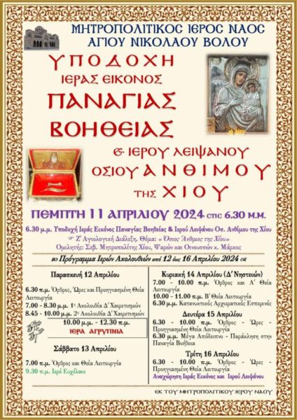Ξεχωριστή τιμή και ευλογία για την Τοπική Εκκλησία συνιστά η έλευση και η ολιγοήμερη παραμονή στην πόλη του Βόλου της Ιεράς και Θαυματουργού Εικόνος της Παναγίας Βοηθείας και του Ιερού Λειψάνου του νεοφανούς Οσίου Ανθίμου της Χίου, που φυλάσσονται στην Ιερά Μονή Παναγίας Βοηθείας της μυροβόλου και ακριτικής νήσου Χίου.
