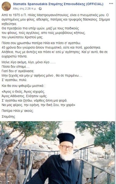 04/02/2020 04/02/2020 “Από το 1975, ο π. Ηλίας Μαστρογιαννόπουλος, είναι ο πνευματικός μου” γράφει σε επίκαιρη ανάρτησή του, ο μουσικοσυνθέτης Σταμάτης Σπανουδάκης. “Ο αγαπημένος μου φίλος, αδελφός, πατέρας και τρυφερός δάσκαλος. Σήμερα, κηδεύτηκε”.     Ο μουσικοσυνθέτης συνεχίζει με λόγια που σπαράσσουν την καρδιά του ευλαβούς αναγνώστη: “Θα πρεσβεύει πια υπέρ υμών, μαζί με τους παιδικούς του...