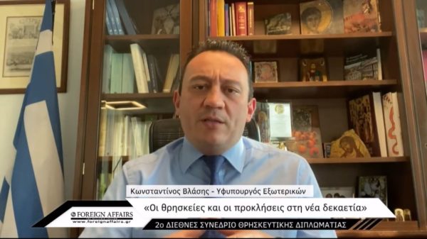 Η χώρα μας αποτελεί σταυροδρόμι πολιτισμών και θρησκειών και η συνθήκη αυτή μας καλεί να αναπτύξουμε μια πολυδιάστατη θρησκευτική διπλωματία, τόνισε ο υφυπουργός Εξωτερικών, Κώστας Βλάσης, κατά τον χαιρετισμό του στο διεθνές διαδικτυακό Συνέδριο Θρησκευτικής Διπλωματίας, με θέμα «Οι θρησκείες και οι προκλήσεις στη νέα δεκαετία».